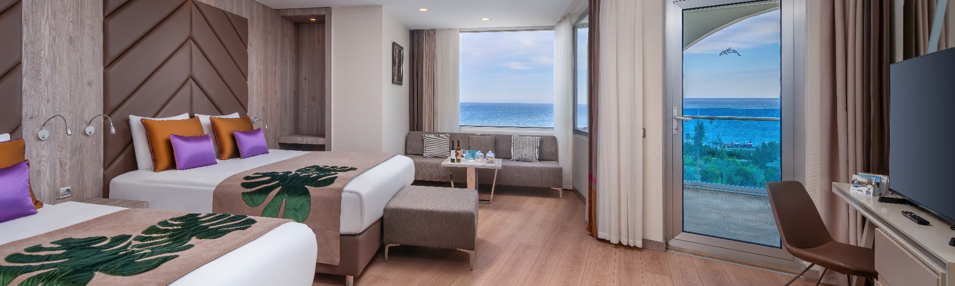 There are only 280 rooms of this room type in our facility. Each room is 42 m2. In each room is 1 french bed, 1 Single bed, 1 Sofa (Maximum Accommodation: 3+1 or 2+2) or 1 french bed + 1 Sofa (Maximum Accommodation: 2+1). In the rooms there are  Balcony, Shower / WC, air conditioning (central and between certain hours), hair dryer, direct dial telephone, LCD TV (satellite), music, safe, mini bar, Laminate, kettle, tea and coffee. Every day housekeeping, towels are changed every day, sheets are changed every 2 days 1 time. The rooms have Sea View, Side Sea View or Land View. (Sofa Bed: 160x80 cm).