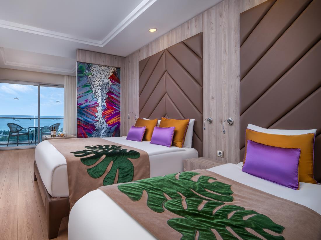 There are only 313 rooms of this room type in our facility. Each room is 35 m2. In each room is 1 french bed, 1 Single bed, 1 Sofa (Maximum Accommodation: 3+1 or 2+2) or 1 french bed, 1 Sofa (Maximum Accommodation: 2+1). In the rooms there are Balcony, shower / WC, air conditioning (central and between certain hours), hair dryer, direct dial telephone, LCD TV (satellite), music, safe, mini bar, Laminate, kettle, tea and coffee. Every day housekeeping, towels are changed every day, sheets are changed every 2 days 1 time. The rooms have Sea View, Side Sea  View or Land View. (Sofa Bed: 160x80 cm).