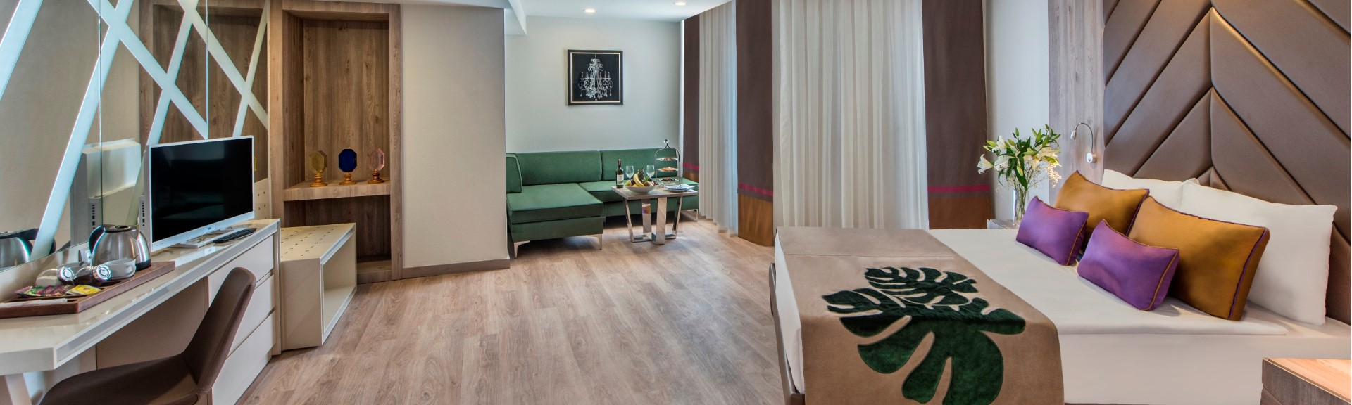 Be Family B Room (Family Suite) in Delphin Be Grand has a consisting of 2 rooms and 2 bathrooms. The rooms are very spacious and there are in one room is 1 french bed, in the other room is 2 single bed, 1 sofa. In these rooms, you can find shower systems with 24/7 access to hot water. Also, there is a hairdryer that you can use after showering for personal care. You can find central air conditioners that work between certain hours, LCD televisions that allow you to watch the satellite channel whenever you want, and direct phones that you can connect to the hotel reception. In addition; safe, mini bar, kettle, tea, and coffee are among the services of the hotel. Rooms are cleaned daily and towels are changed every day. Sheets are changed every two days. The rooms have balconies and all rooms have land views. You can benefit from free and unlimited Wi-Fi services. The rooms have laminate flooring and the maximum accommodation in the rooms is determined as 4 adults + 1 child or 3 adults + 2 children. During the hotel reservation, you can benefit from the extra services according to your accommodation type.