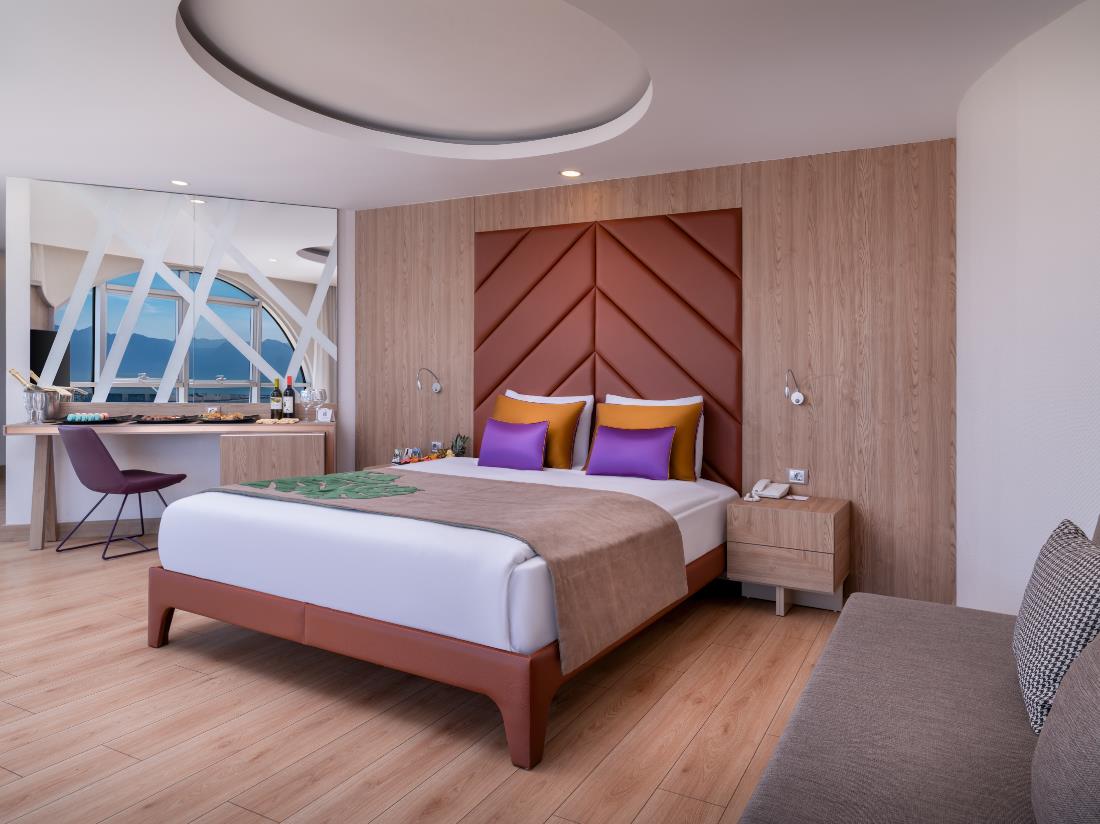 Be Royal Room (Duplex) in Delphin Be Grand has a large bedroom and 2 bathrooms and sauna. The rooms are very spacious and there are 2 french beds. In these rooms, you can find shower systems with 24/7 access to hot water. Also, there is a hairdryer that you can use after showering for personal care. You can find central air conditioners that work between certain hours, LCD televisions that allow you to watch the satellite channel whenever you want, and direct phones that you can connect to the hotel reception. In addition; safe, mini bar, kettle, tea, and coffee are among the services of the hotel. Rooms are cleaned daily and towels are changed every day. Sheets are changed every two days. The rooms have balconies and all rooms have land views. You can benefit from free and unlimited Wi-Fi services. The rooms have laminate flooring and the maximum accommodation in the rooms is determined as 4 adults. During the hotel reservation, you can benefit from the extra services according to your accommodation type.