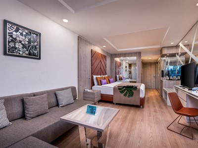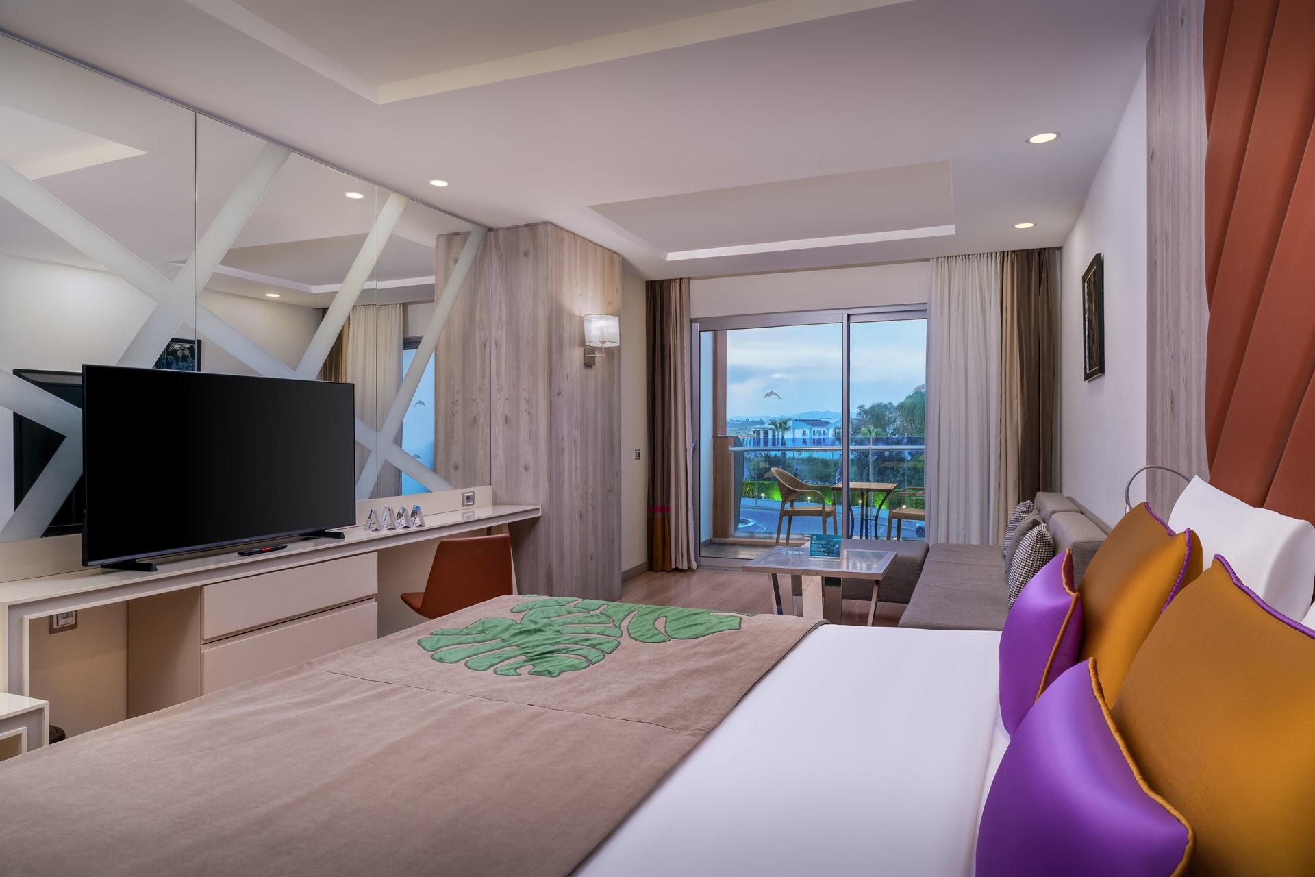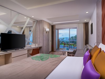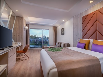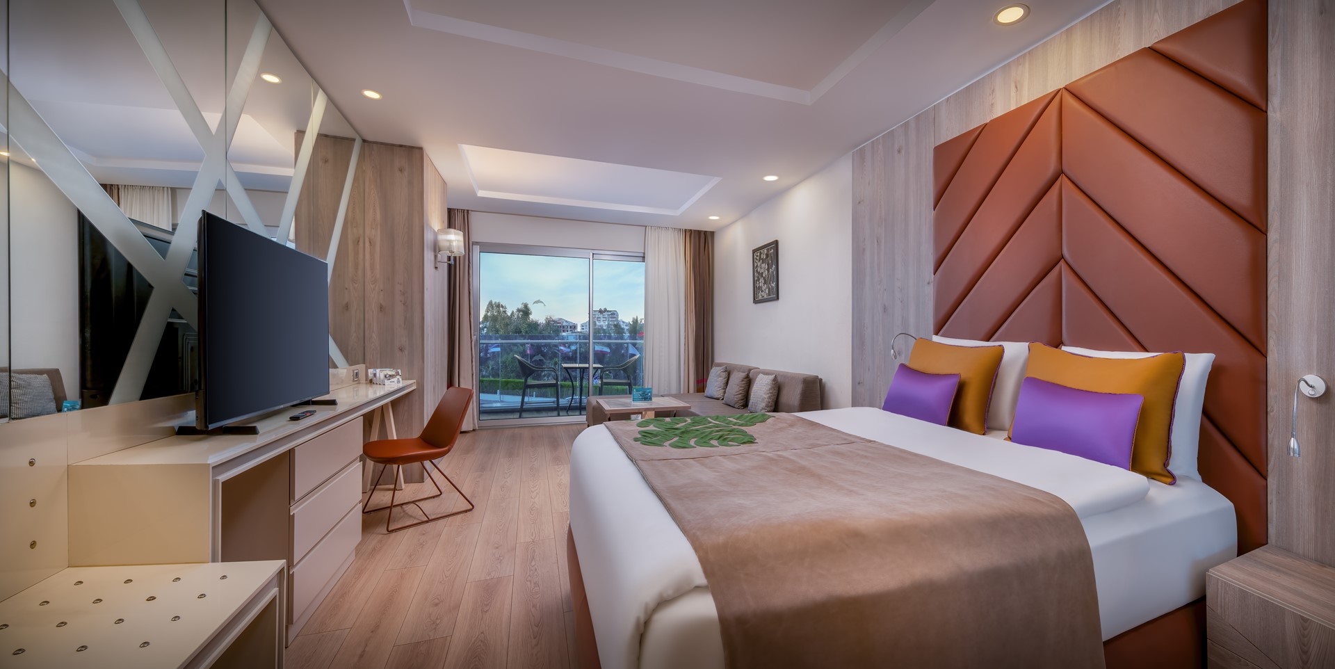 Standard Be Trendy Handicapped Room in Delphin Be Grand has a large bedroom and a bathroom. Located on the ground floor. The rooms are very spacious and there are one double bed. In these rooms, you can find shower systems with 24/7 access to hot water. designed for disabled guests. Also, there is a hairdryer that you can use after showering for personal care. You can find central air conditioners that work between certain hours, LCD televisions that allow you to watch the satellite channel whenever you want, and direct phones that you can connect to the hotel reception. In addition; safe, mini bar, kettle, tea, and coffee are among the services of the hotel. Rooms are cleaned daily and towels are changed every day. Sheets are changed every two days. The rooms in the hotel have balconies and all rooms have land views. You can benefit from free and unlimited Wi-Fi services. The rooms have laminate flooring and the maximum accommodation in the rooms is determined as 2 adults. During the hotel reservation, you can benefit from the extra services according to your accommodation type.