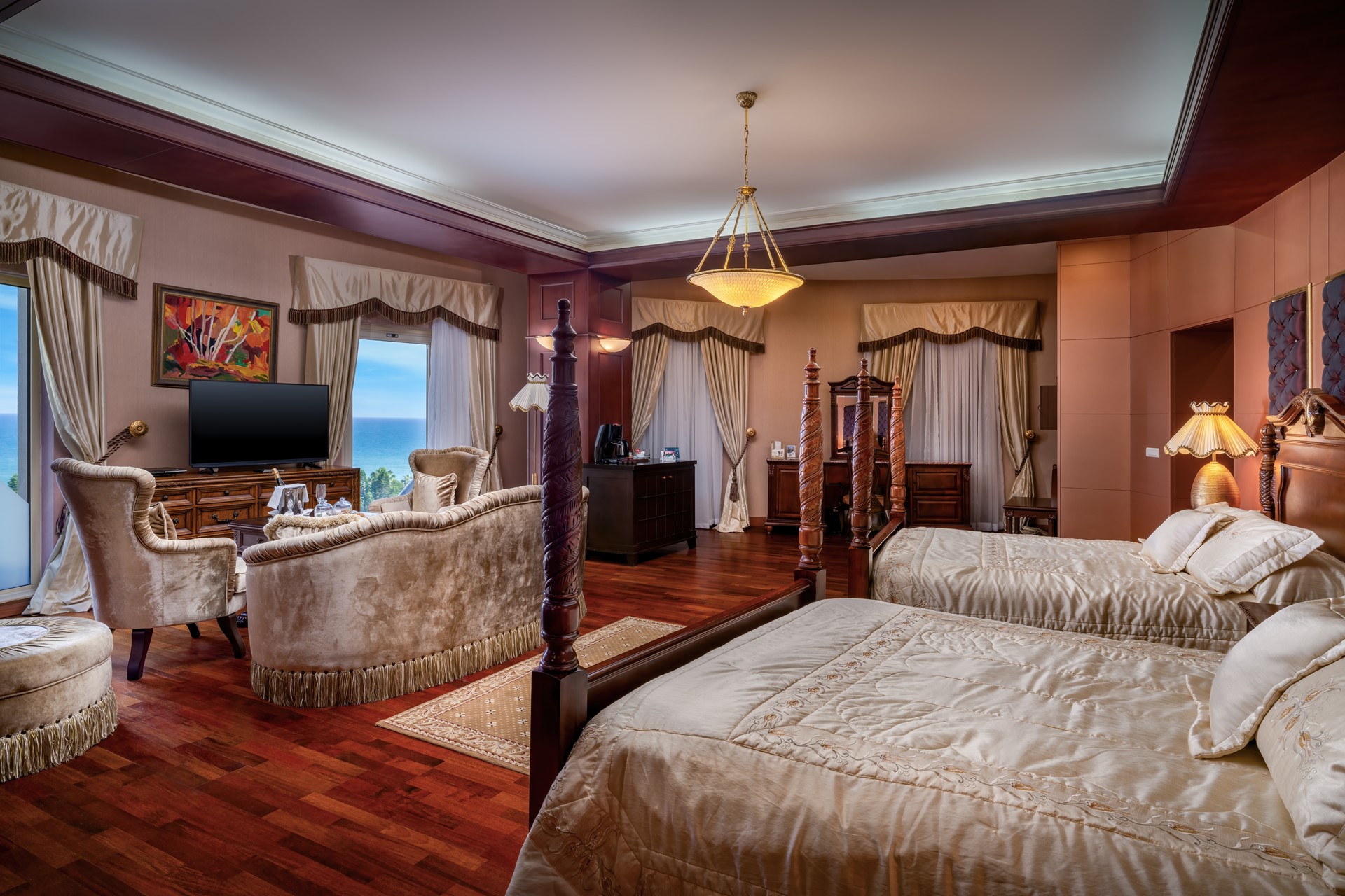 K2 Suite in Delphin Diva is a lavishly decorated round room has a bedroom, seating and a bathroom. The room are very spacious and there are one double bed. In these room, you can find shower systems, jacuzzi with 24/7 access to hot water. Also, there is a hair dryer that you can use after showering for personal care. You can find central air conditioners that work between certain hours, LCD televisions that allow you to watch the satellite channel whenever you want, and direct phones that you can connect to the hotel reception. In addition; safe, mini bar, kettle, tea, and coffee are among the services of the hotel. Room is cleaned daily and towels are changed every day. Sheets are changed every two days. The Room in the hotel have no balconies and all room has panoramic sea view. You can benefit from free and unlimited Wi-Fi services. The rooms have laminate flooring and the maximum accommodation in the room is determined as 2 adults. During the hotel reservation, you can benefit from the extra services according to your accommodation type.