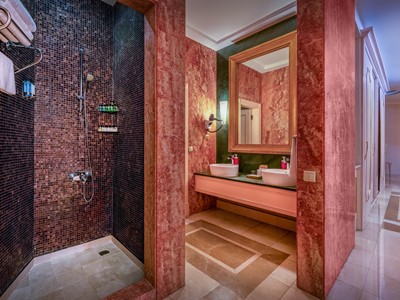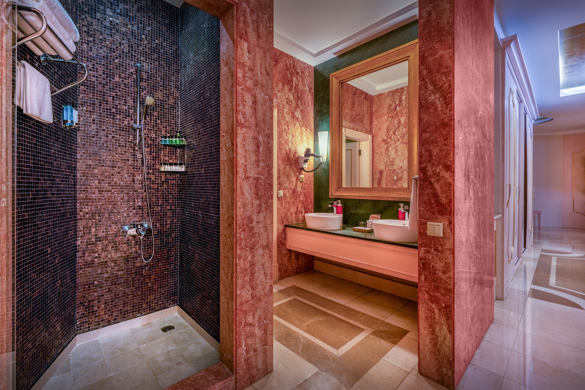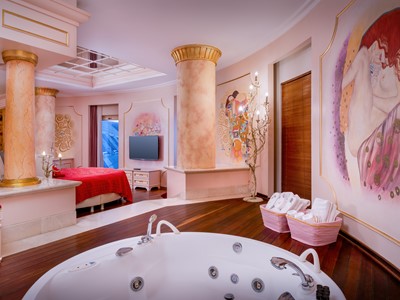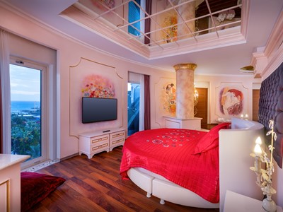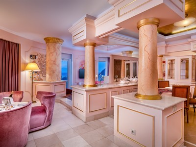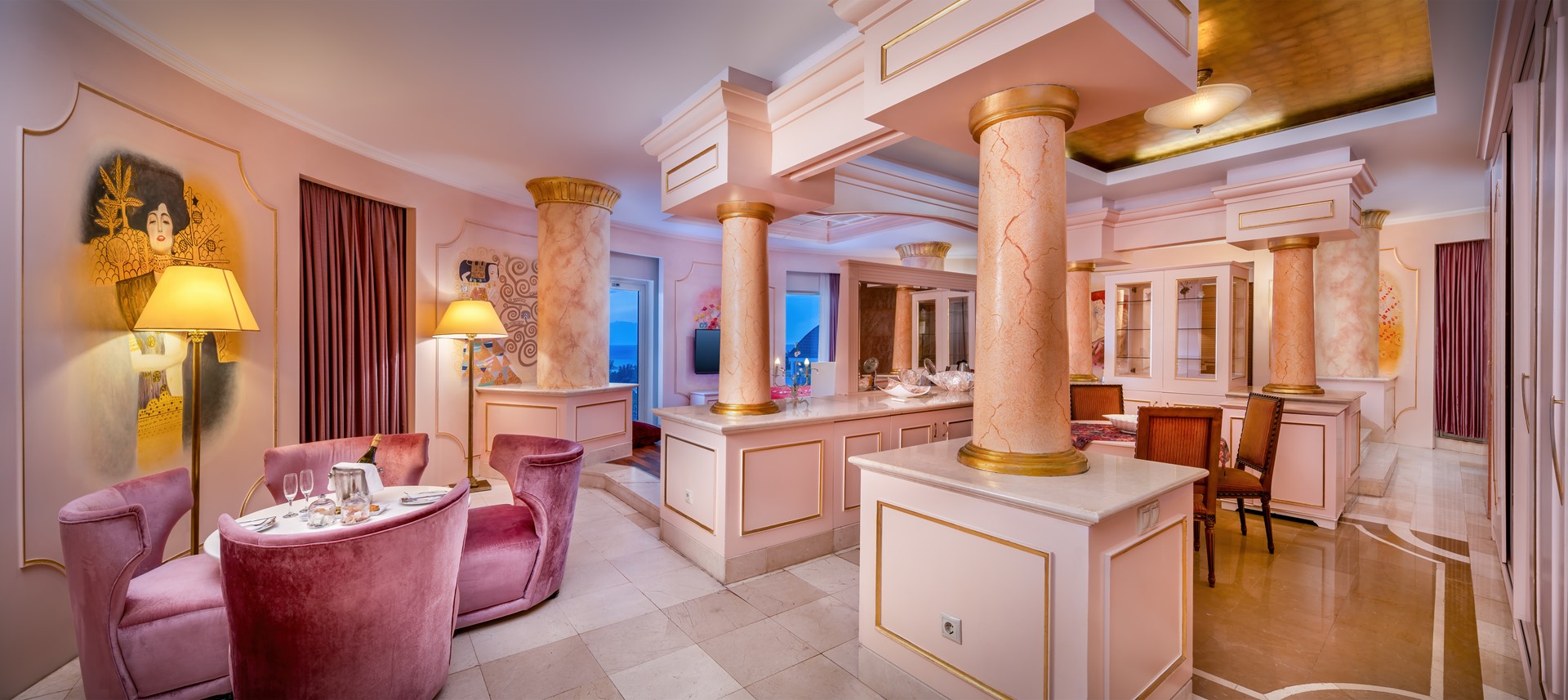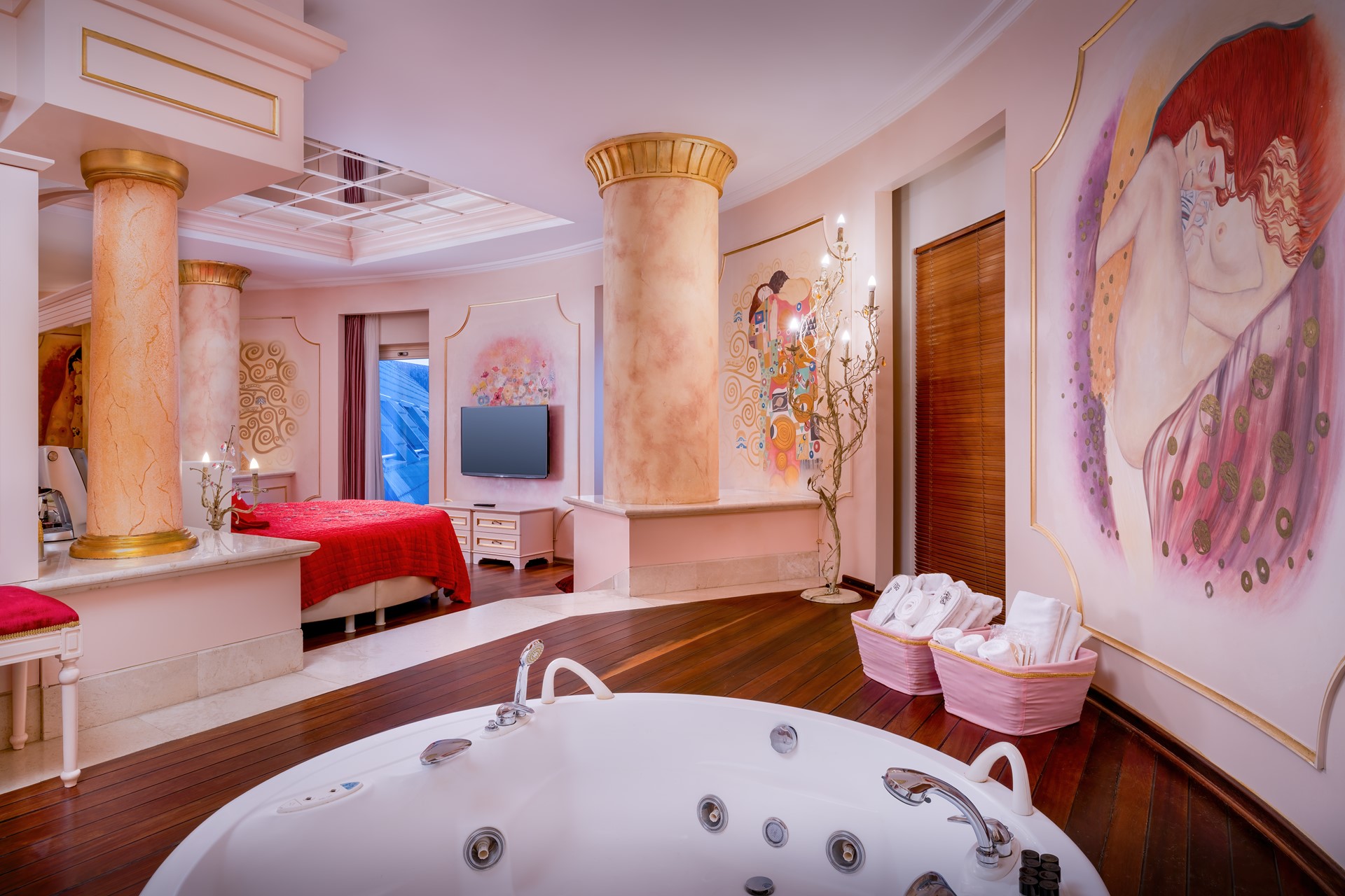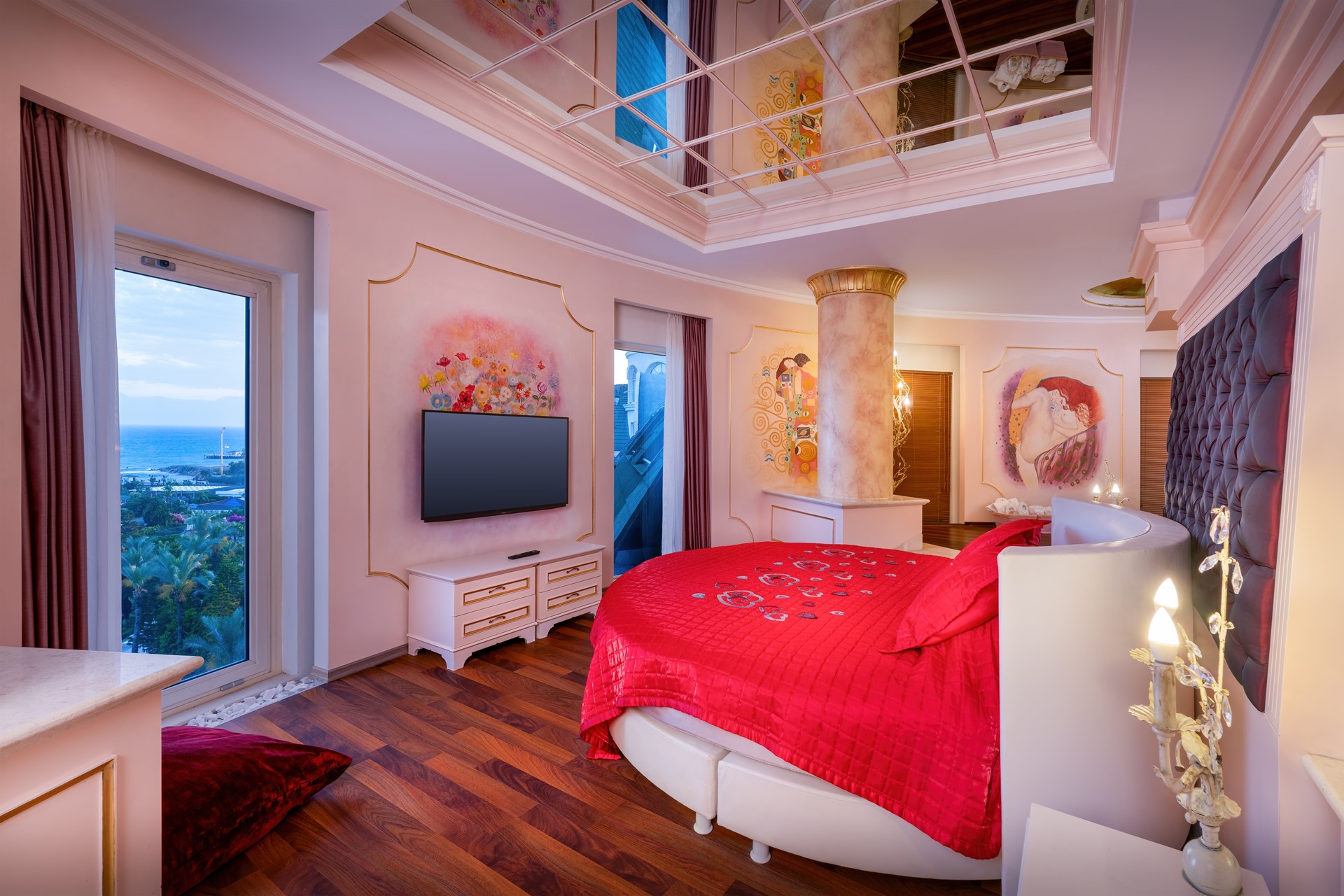 Delphin Diva’da yer alan Pink suite; balayı çiftlerine özel olarak pembe dekore edilmiş yuvarlak oda bölümlere ayrılmıştır. Yatak odası, oturma odası, yemek bölümünden oluşmaktadır. Odada 7/24 sıcak suya erişebileceğiniz duş sistemleri, jakuzi ve kişisel bakım ihtiyacı olarak kullanabileceğiniz saç kurutma makinesi yer almaktadır. Özel klima, her daim istediğiniz uydu kanalını izleyebilmenizi sağlayan LCD televizyon ve otel resepsiyonuna bağlanabileceğiniz direkt telefon mevcuttur. Otel hizmetleri arasında yer alan kasa, mini bar, kettle, çay ve kahve ise her oda tipinde bulunmaktadır. Odada günlük olarak temizlik yapılmakta ve havlular her gün değiştirilmektedir. Çarşaflar ise iki günde bir olacak şekilde değiştirilir. Otelde yer alan odada balkon bulunmamaktadır. Ücretsiz ve sınırsız olarak Wi-Fi hizmetlerinden yararlanabilirsiniz. Laminant zemin kaplamaya sahip olan odadaki maksimum konaklama şekli ise 2 yetişkin olacak şekilde belirlenmiştir. Otel rezervasyonu sırasında konaklama şeklinize uygun olarak ekstra hizmetlerden faydalanabilirsiniz.